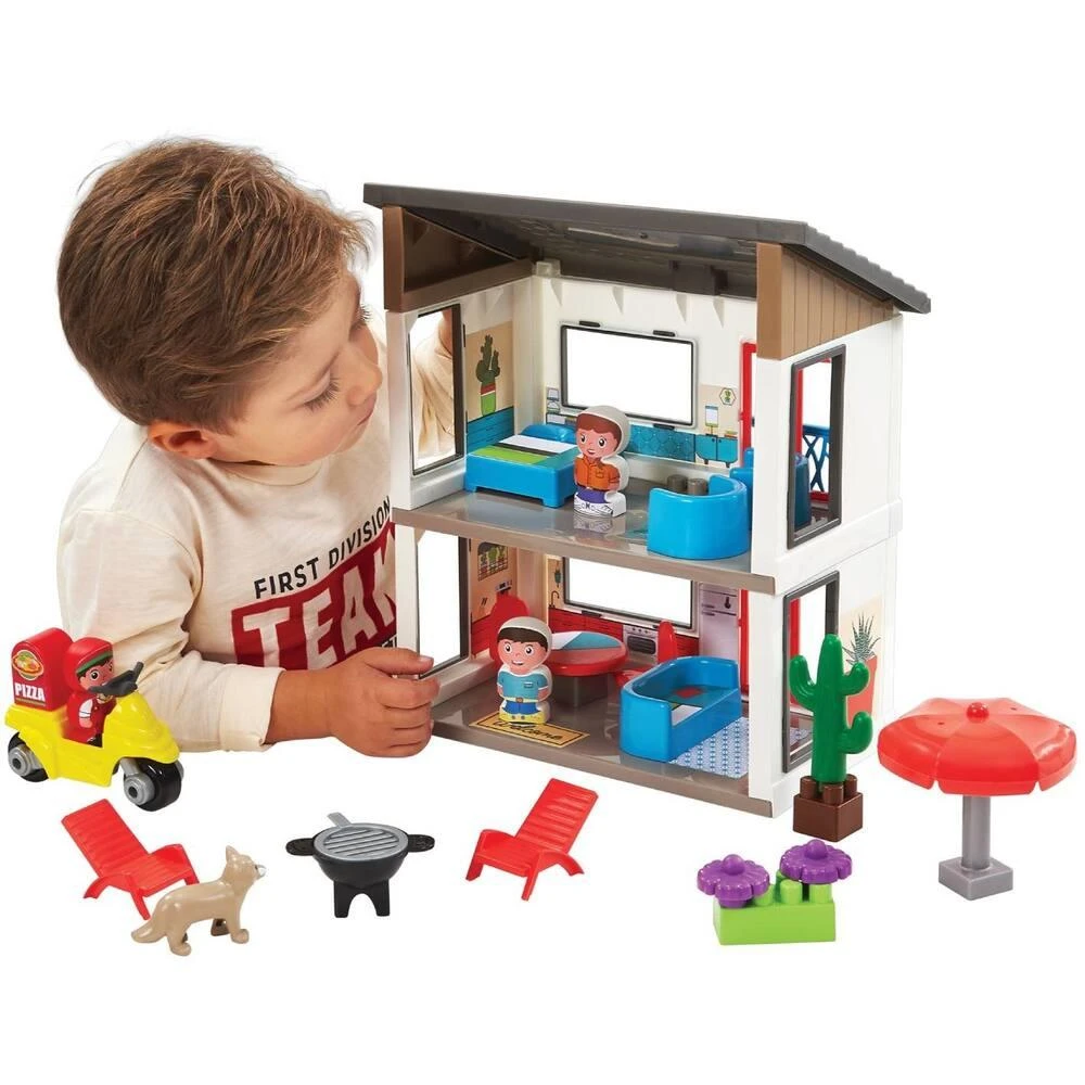 Au rez-de-chaussée, 1 cuisine et 1 salon, à l’étage, 1 chambre. Avec 3 personnages, 1 chien et des accessoires.