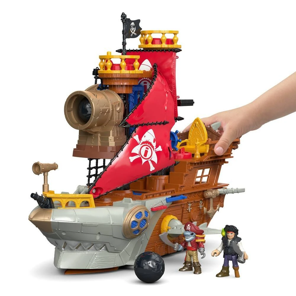 Protéger votre trésor grâce à ce bateau pirate à tête de requin. Faites rouler le bateau pour que sa gueule s’ouvre et que ses aileront bougent. Actionnez les boutons poussoir pour lancer des projectiles et des boulets de canon. Jetez les prionnisers par la planche et révéler la cachette secrète du trésor. Inclut un bateau requin, 2 personnages, 2 épées, 2 boulets de Canon, 4 projectiles, une longue vue et un trésor.