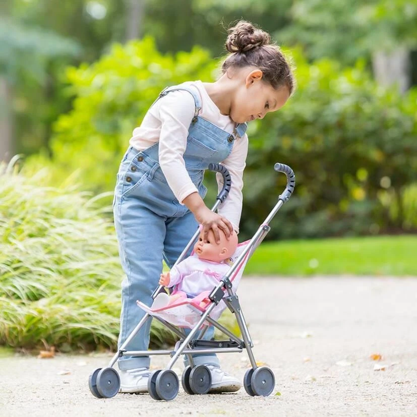 « On va se promener bébé ? » Cette poussette-là; elle a tout l’air d’une poussette de grand ! La poussette Canne est idéale pour emmener son grand poupon de 36 cm à 42 cm en balade ! On assied son poupon dans la poussette; une jambe de chaque côté de la ceinture et on l’attache : hop; c’est parti ! Légère et pliable; elle est facile à transporter et ne prend pas de place quand vient le moment de la ranger. Lorsqu’il faut la plier; il y a deux points de fermeture pour protéger les petits doigts des pincements.