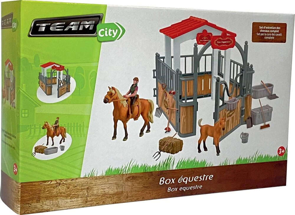 Découvre le monde équestre. Set d’entretien des chevaux complet. Avec de nombreux accessoires dont 1 box équestre, 1 cheval, 1 poulain et 1 cavalière. Figurines (animaux et humain) : non articulées. En plastique. A assembler : box équestre 8.5 x 14 x 16 cm. Dimensions du cheval 14 x 3 x 11 cm, poulain 9.5 x 3 x 8.5 cm. Faisons l’expérience de la vie au ranch ensemble.