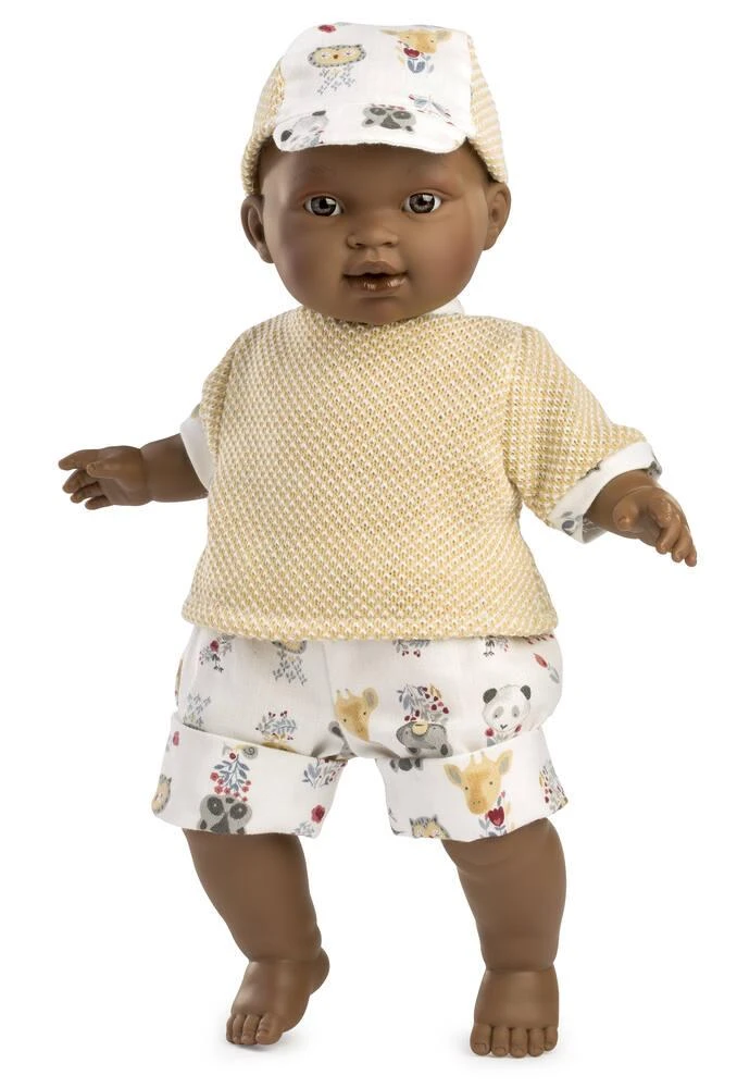 Poupon de 38 cm au corps souple rembourré. Il porte des habits d’été : un short, un pull léger et une casquette. Les cheveux sont gravés. Matières des vêtements : 100% polyester. Vêtements : lavage à la main préconisé.