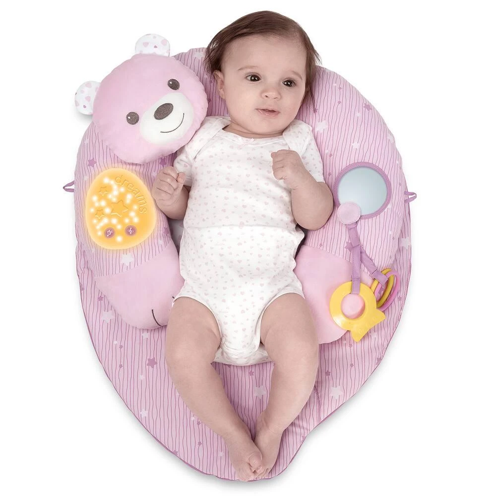 Un coussin évolutif musical et lumineux qui permet à votre enfant de se détendre paisiblement pendant les différentes phases de croissance. Dés 2 mois position sur le ventre, pour renforcer le cou et les épaules de bébé. A partir de 6 mois soutien pour la position assise. Electronique : 30 minutes de musique (classique, soft rock, jazz) et effets de lumières. Avec un miroir et un anneau de dentition. Lavable en machine.