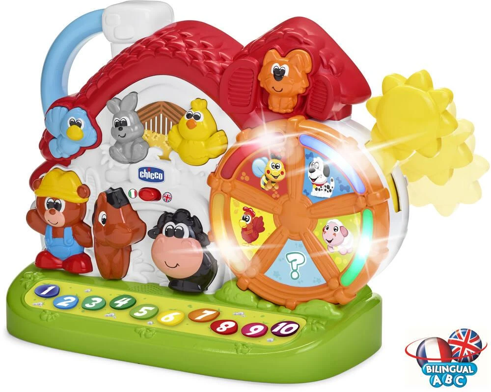 Ferme qui apprend aux tout petits les animaux de la ferme en français et en anglais. Ainsi que plus de 50 mots, questions chansons et sons. Effets sonores et lumineux.