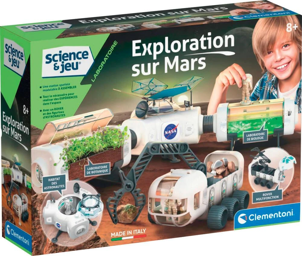 Une station spatiale futuriste de la NASA avec un rover à assembler et de nombreuses expériences captivantes, pour se lancer dans un voyage passionnant à la découverte de la planète Mars. La station spatiale est composée d’éléments modulables et peut être assemblée avec diverses combinaisons. L’enfant peut se mettre dans la peau d’un véritable astronaute et réaliser des expériences botaniques et observer des êtres vivants à l’intérieur des modules. Avec le rover spécial, il peut partir en voyage sur Mars pour collecter des échantillons du terrain et étudier leur composition ! Le manuel contient de nombreux secrets sur la mystérieuse planète rouge, la vie des astronautes et les missions passées sur Mars.