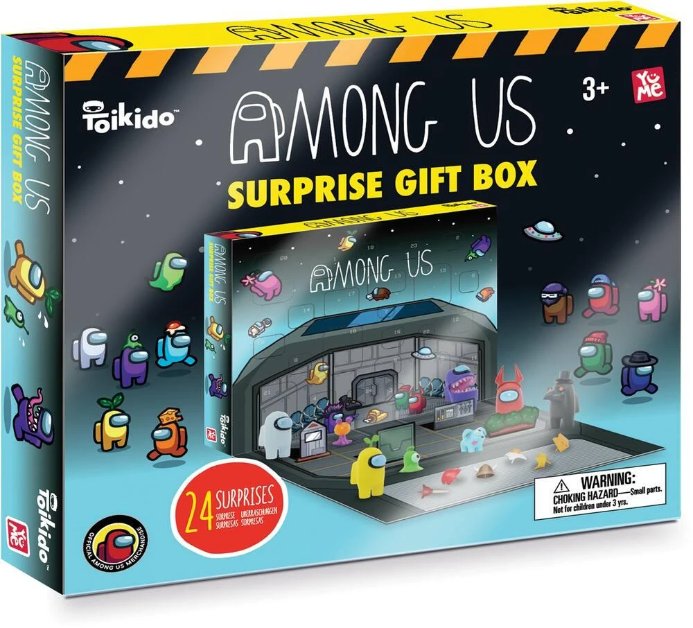 Coffret cadeau contenant 24 surprises à découvrir : 5 personnages (figurines de 5 cm), 5 animaux de compagnie et 14 accessoires ! Le panneau avant de la boîte s’ouvre, imitant le plancher du vaisseau spatial. Licence : Among Us.