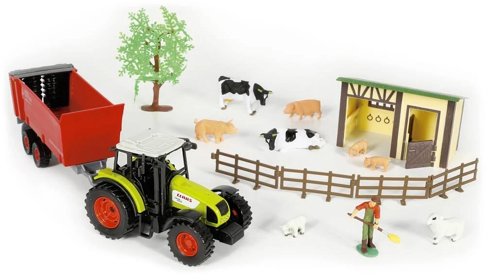 Coffret de ferme pour créer l’univers de la ferme ! Il contient 1 tracteur Claas et sa remorque, un fermier, un arbre, 4 barrières, un abris pour les animaux de la ferme (2 vaches, 4 cochons et 2 moutons). Starlux. Echelle 1:32.