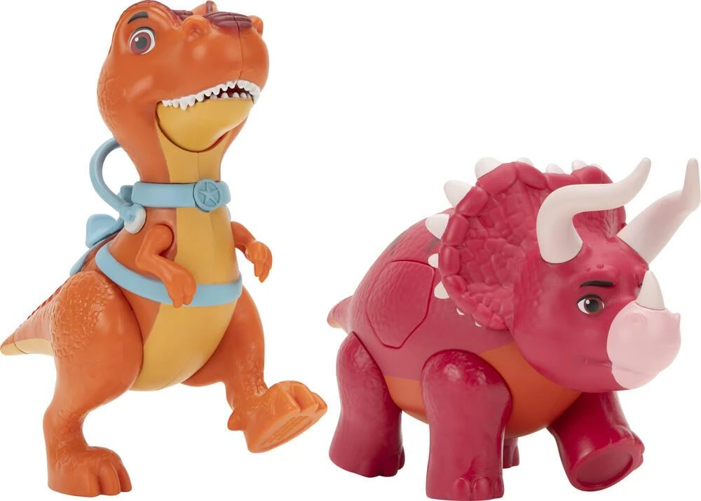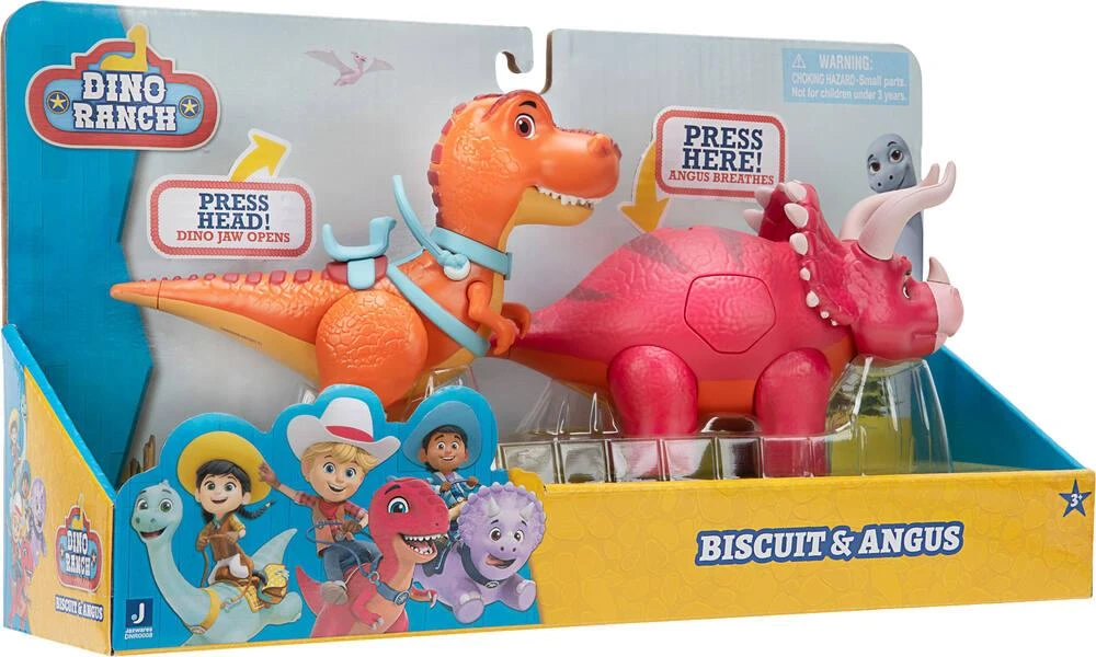 Dino Ranch. Pack Deluxe contenant 2 figurines Dinos. Modèles assortis dont : Biscuit et Angus (Réf. DNR0008). Figurines articulées entre 10-13 cm : Biscuit le T-Rex 13 cm, Angus le tricératops 10 cm . Avec fonctions : un bouton stimule la respiration d’Angus, la mâchoire de Biscuit bouge. Instructions imprimées sur la boîte.