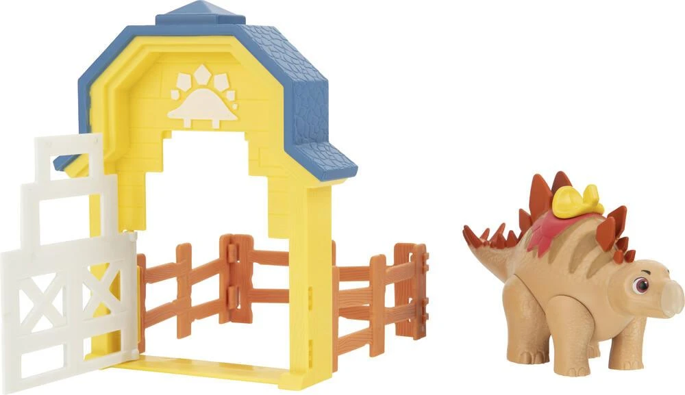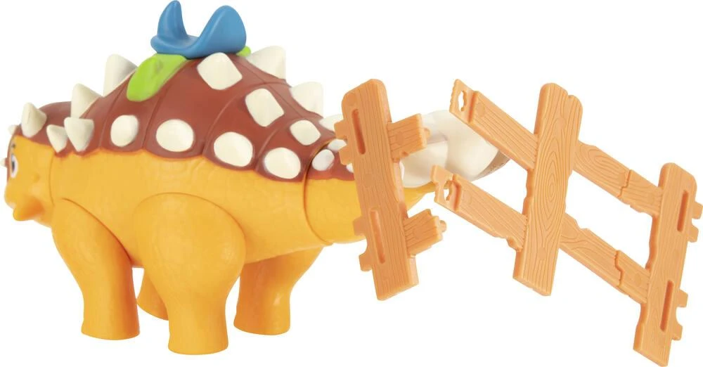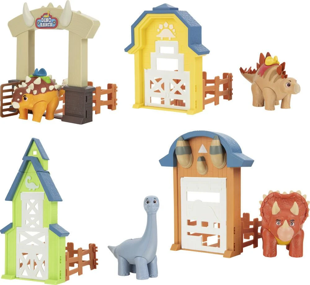 Dino Ranch. Pack action. 4 modèles assortis : Ankylosaure (Réf. DNR0021), Stégosaure (Réf. DNR0022), Brontosaure (Réf. DNR0023), et Tricératops (Réf. DNR0024). Contient : 1 façade de 13 cm, 1 figurine Dino articulée de 10 cm et 4 barrières. Collectionne-les tous ! Notice incluse. En plastique.
