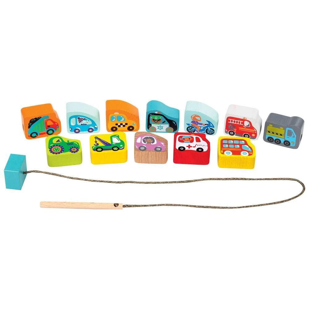 12 blocs en bois à enfiler sur une cordelette à l’aide d’une longue aiguille en bois. Les blocs sont ornés de divers types de véhicules tels que voiture, moto, tracteur, ambulance, taxi, dépanneuse, camion poubelles, pompier, police… 8 cartes fournies pour indiquer à l’enfant différentes séquences pour enfiler les éléments. Les blocs peuvent aussi être utiliser séparément. En bois : hêtre et sycomore. Permet de se familiariser avec les formes et de découvrir les couleurs. Développe la motricité fine et le raisonnement logique. Livré en boîte couleur. Produit en bois certifié.