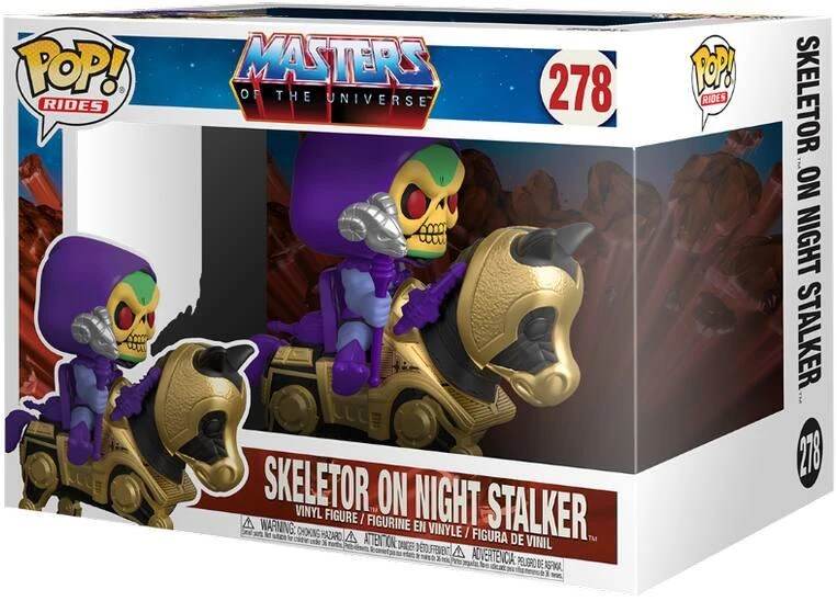 Série Pop! Rides. Licence : Les Maîtres de l’Univers (en anglais Masters of the Universe). Figurines en vinyle. Il s’agit du cheval mécanique Night Stalker transportant Skeletor.