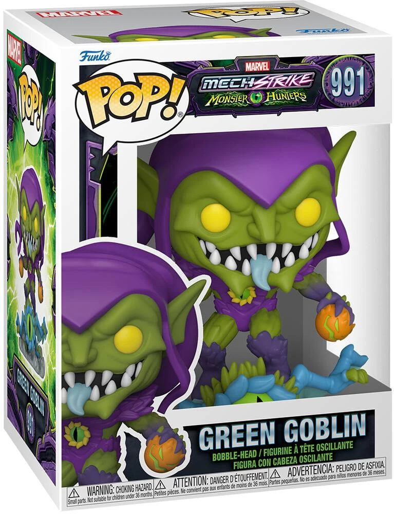 Série Pop! Marvel Mech Strike: Monster Hunters. Figurine en vinyle avec tête dodelinante (oscillante). La tête montée sur ressort bouge d’un côté à l’autre. Il s’agit du personnage du Bouffon Vert (Green Goblin en anglais), un super-vilain évoluant dans l’univers Marvel.