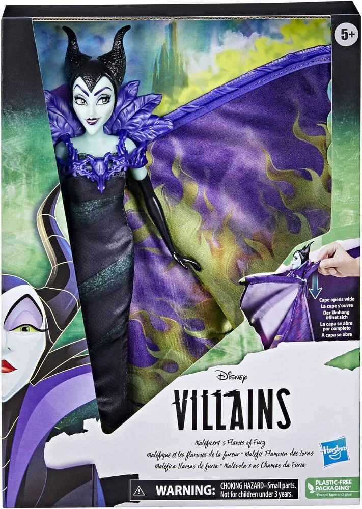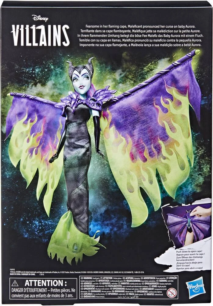 La Poupée mannequin Disney Villains : Maléfique et les flammes de la fureur d’Hasbro est à l’effigie de Maléfique, le personnage inspiré de la méchante dans le film de Disney La Belle au Bois Dormant. Haute de 27,5 cm, elle porte une tenue splendide avec coiffe à cornes et une cape déployable. Il suffit d’appuyer sur le levier sur le dos de la poupée Maléfique et sa cape verte et violette flamboyante se déploie. Les enfants, dès 5 ans, vont dorer ouvrir et refermer la cape de Maléfique à loisirs.