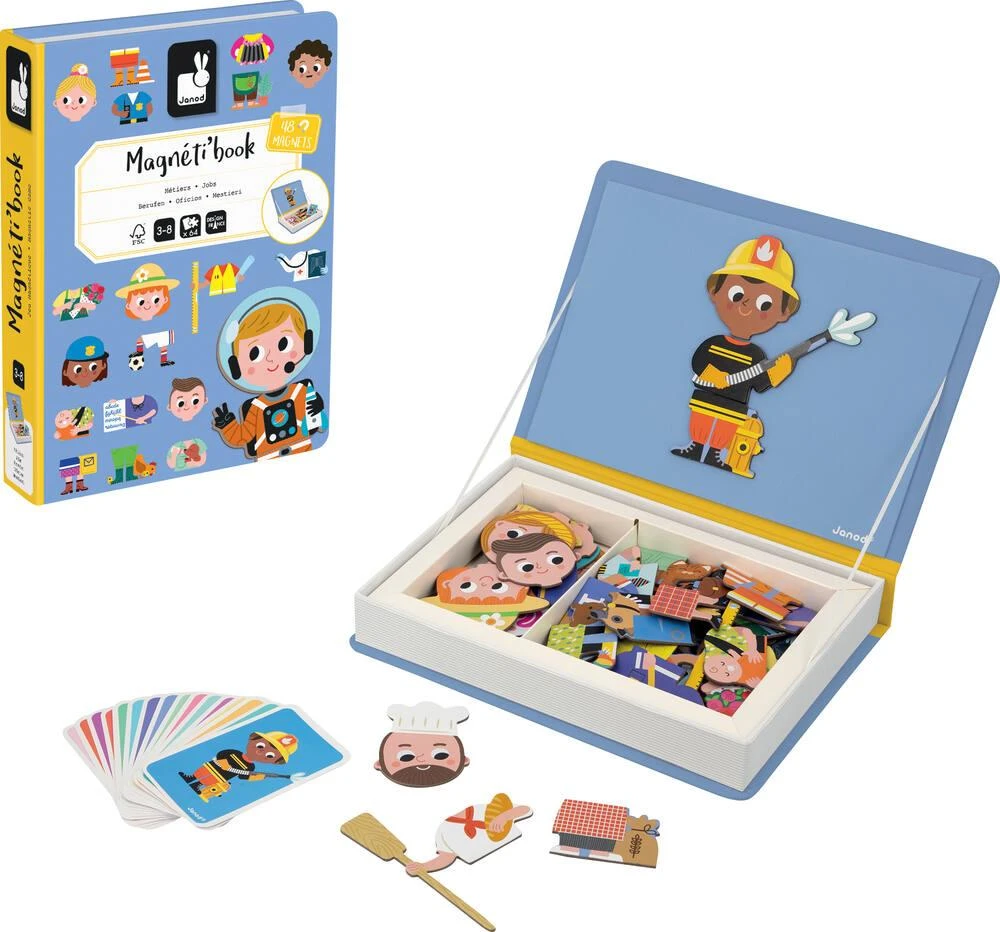 Quand je serai grand(e), je serai…. Ouvre ton magnéti’book pour partir à la découverte des métiers ! Avec ce joli jouet magnétique coloré, votre enfant découvrira 16 métiers, avec la possibilité d’en inventer plein d’autres ! Il est composé d’un support magnétique, de 48 magnets et de 16 cartes représentant des métiers connus. Les plus petits comme les plus grands s’amuseront à reproduire les modèles et à les mélanger pour imaginer des mix de métiers tous plus farfelus les uns que les autres. Jouet magnétique en carton FSC™ pour les enfants –