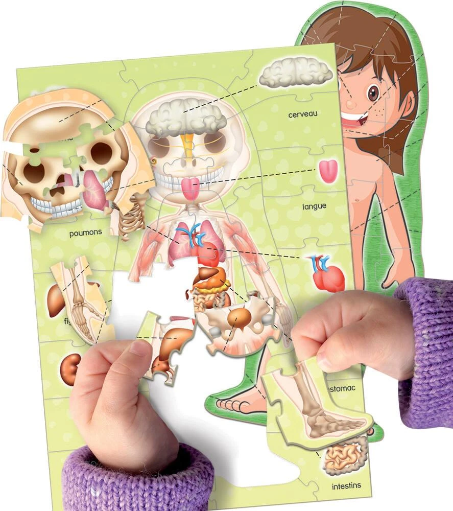 Avec ce jeu amusant les enfants apprendront les différentes parties du corps humain de façon amusante. Sur la silhouette d’un petit garçon ou d’une petite fille, ils pourront insérer les principales parties du corps, du squelette et les organes. Les enfants apprendront à nommer les parties du corps, situer les différents organes, identifier les os principaux. Avec 99 pièces pour former 4 puzzles (garçon, fille, squelette et organes), 1 cadre avec les parties du corps, instructions.
