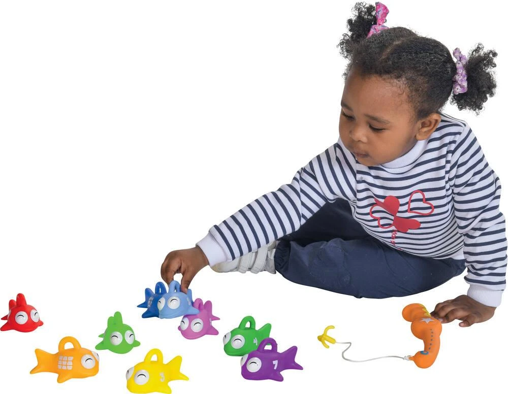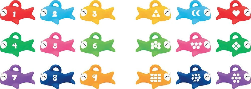 Contient 2 cannes à pêche et 9 poissons colorés. Chaque poisson possède un chiffre et des formes pour encourager l’apprentissage. Découvre le plaisir de la pêche grâce à ces poissons colorés. Des heures d’amusement dans le bain en perspective ! Facile à manipuler. Développement de la motricité et de la coordination main-œil. Dimensions : d’une canne à pêche 21 x 4.5 x 2.88 cm, d’un poisson 9 x 6.5 x 5 cm.