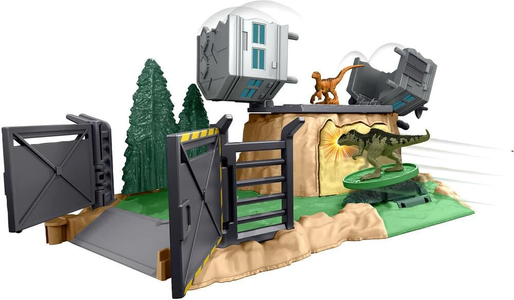 Coffret de mini dinosaures avec playset modulable pour reproduire des scènes du film dans un mini univers. Un mini dinosaure et un mini dinosaure plus imposant sont inclus
