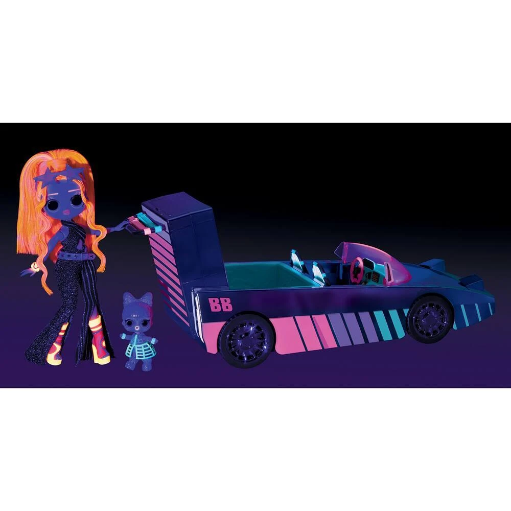 Véhicule avec sièges réglables, piscine et piste de danse ! Les phares s’allument. Contient 1 poupée (7,5 cm). Autres poupées non incluses.
