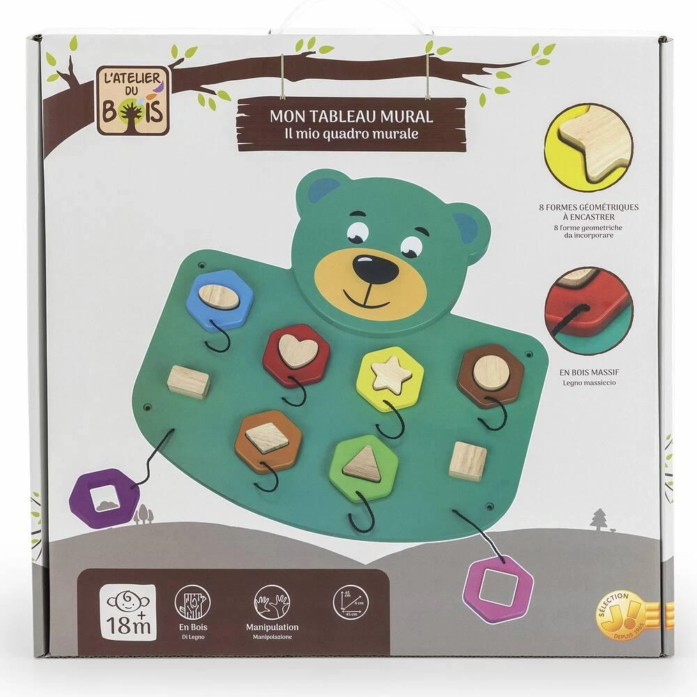 Ce joli tableau avec une tête d’ours permet aux enfants la reconnaissance des formes géométriques et des couleurs. L’enfant doit encastrer les 8 formes correspondantes, il peut aussi s’aider des couleurs. Les pièces à emboîter sont attachées au tableau (via une cordelette). Possibilité d’utilisation posé au sol ou fixé à un mur à hauteur de l’enfant. 4 vis fournies pour la fixation murale. Grosses pièces pour une bonne préhension. Livré assemblé, la fixation au mur doit être effectuée par un adulte. Notice incluse. En bois massif. Poids du produit : 3 kg. Solidité et simplicité en font un bon jeu de dextérité pour les tout-petits. Design et couleurs attrayantes pour stimuler et distraire les enfants.