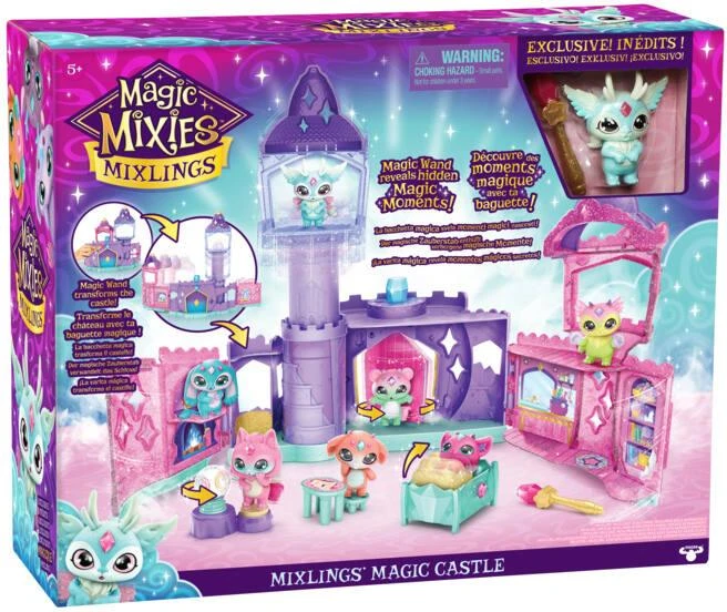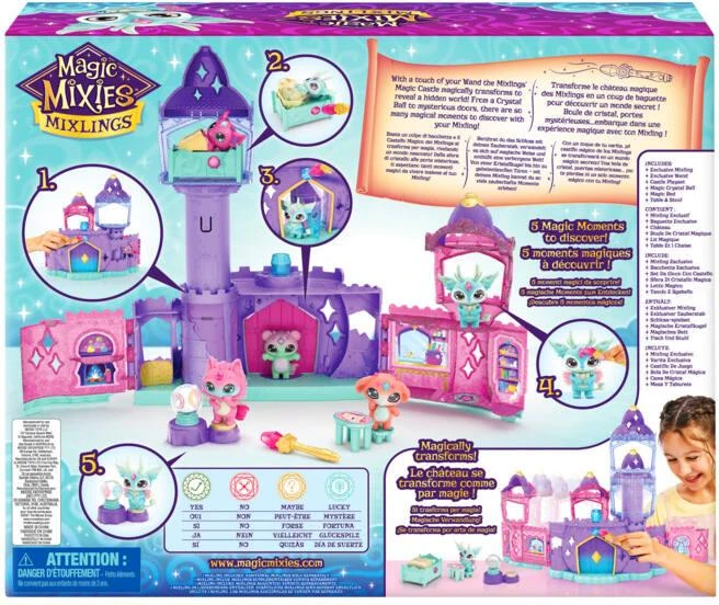 Voyagez dans un pays de magie et de sorts avec les Mixlings, une nouvelle race mignonne de Magic Mixies qui ont leur propre château magique ! Utilisez votre Baguette Magique pour donner vie à votre Château Magique Mixlings ! Tapez votre baguette sur la gemme au-dessus de la porte pour voir le château s’étendre vers l’extérieur et vers le haut avec les murs qui bougent et la tour qui s’élève toute seule ! La magie ne s’arrête pas là ! Utilisez votre baguette magique pour activer l’entrée secrète et laissez-vous surprendre par la disparition magique de votre Mixling dans le château ! Ensuite, faites-vous prédire votre avenir en posant une question à la boule de cristal magique du Mixling pour recevoir une réponse – la réponse sera-t-elle « Oui », « Non » ou « Peut-être » ? Vous pouvez ensuite configurer la table et le tabouret pour que votre Mixie puisse s’asseoir et faire plus de sorts. Puis, après une journée entière de magie, c’est l’heure de votre coucher Mixlings. Placez-les sur leur lit magique et utilisez votre baguette magique pour toucher la gemme sur le côté du lit et laissez-vous surprendre par les couvertures qui recouvrent comme par magie le Mixling ! Le château magique des Mixlings comprend un Mixling exclusif – Magique, dont le pouvoir magique est le pouvoir Flier. Utilisez votre baguette pour faire apparaître ses belles ailes ! Il y a beaucoup de place dans le château magique pour de nombreux autres Mixlings et il convient même aux chaudrons de collection pour construire le monde. Avec plus de 40 Mixlings à créer et à collectionner dans la série 1, il y aura certainement des moments magiques et des méfaits dans chaque pièce !