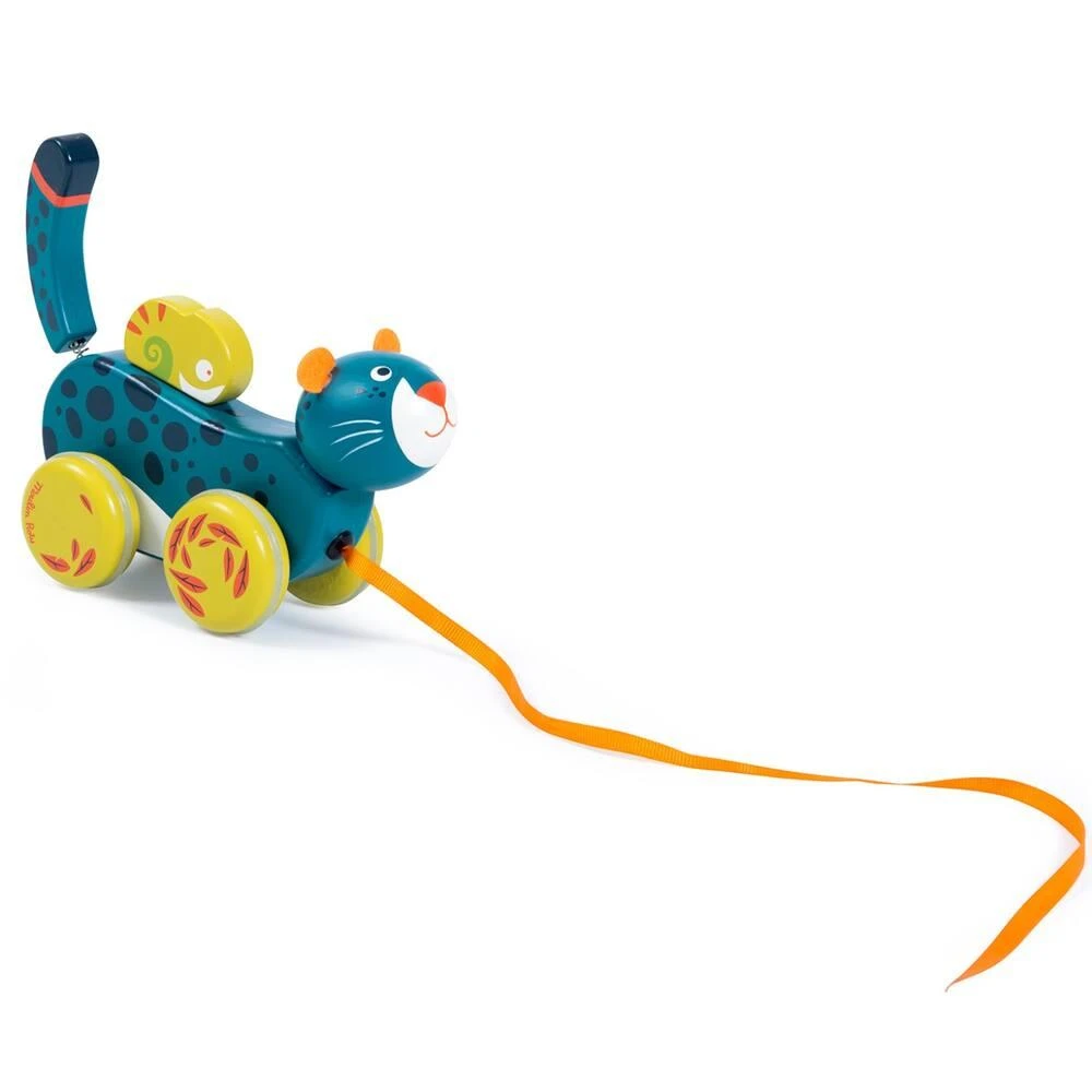 Panthère à tirer en bois, imprimée de motifs de la jungle. Elle repose sur 4 roues désaxées reproduisant le mouvement de ses foulées, et sa queue tenue par un ressort, se met à bouger ! L’enfant jouera aussi avec son ami caméléon tenu par un élastique.