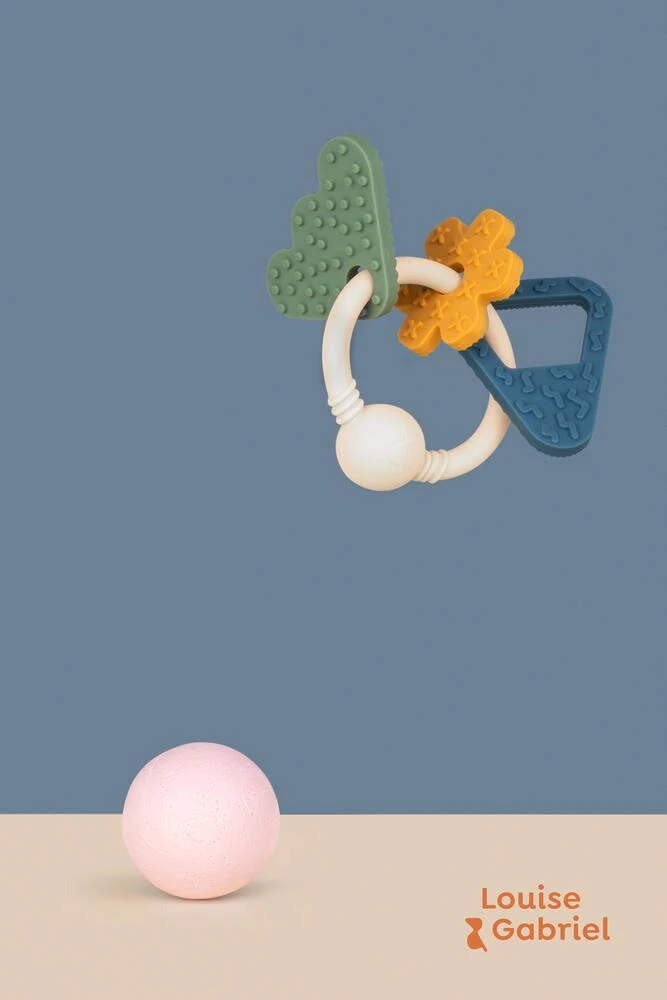 Avec ses formes inspirées de paysages, il fait du bruit grâce à un grelot qui permet de développer l’ouïe. Il est intégralement composé de silicone bénéficiant d’un grade alimentaire (FDA et LFGB standards). Les textures sont multiples permettant ainsi à bébé d’apaiser ses gencives douloureuses pendant les poussées dentaires. Il développe ainsi le toucher grâce à ses formes texturées inspirées de paysages. 3 pièces et un anneau avec grelot : l’ensemble est non détachable. Les pièces passent au lave-vaisselle pour un entretien facilité. Conçu avec une psychomotricienne. Instructions sur la boîte.
