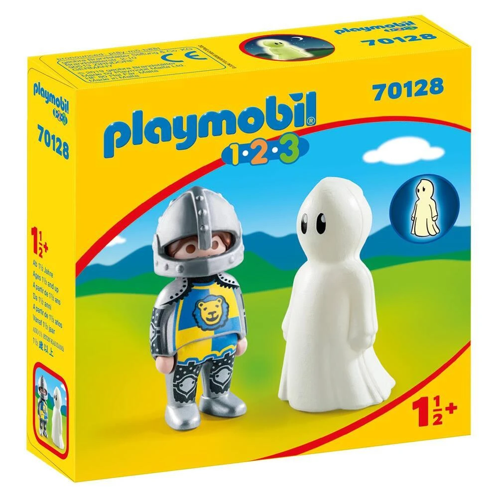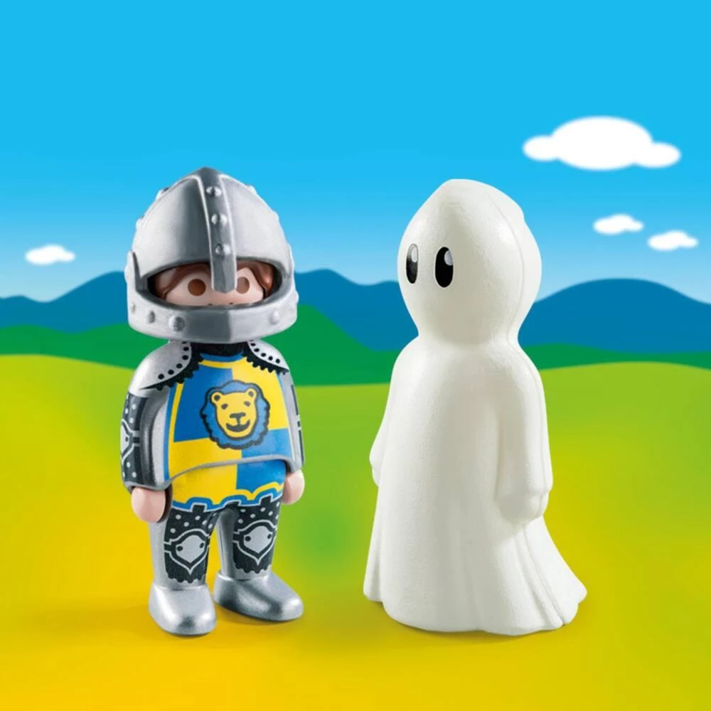 Le chevalier est en compagnie du fantôme qui brille dans le noir. Les PLAYMOBIL 1.2.3 sont colorés avec des formes arrondies, ils aident les enfant à se développer et à apprendre en jouant.