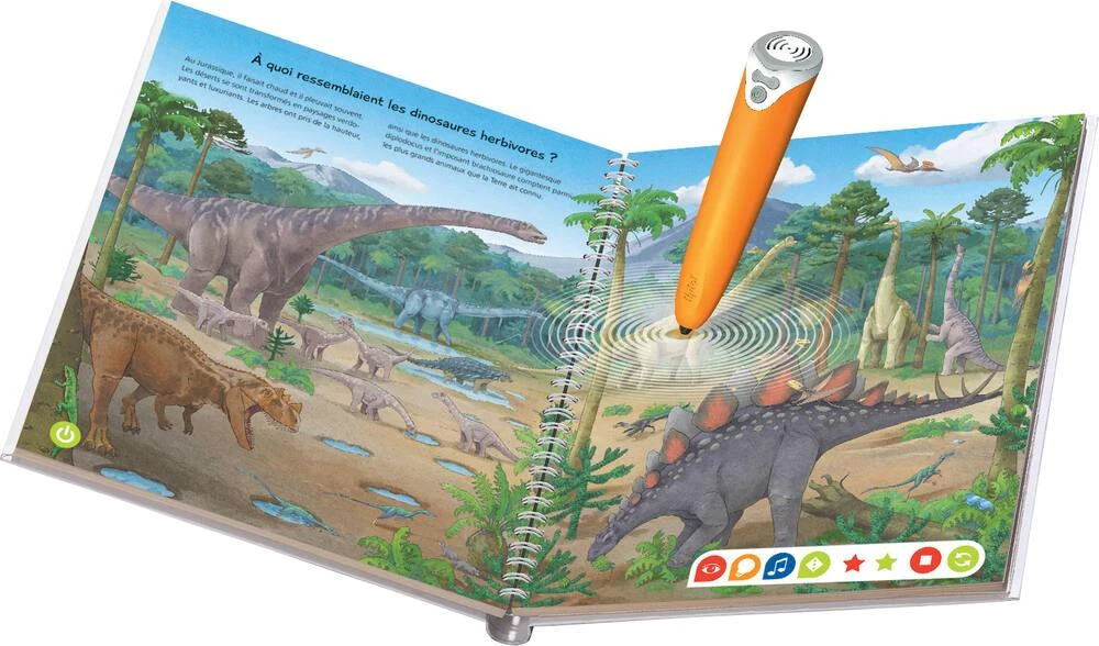 Un Coffret complet contenant un lecteur interactif tiptoi® ergonomique et le livre « Je découvre les dinosaures ». Que sont devenus les dinosaures ? Qui était le plus grand dinosaure ? Qui sont les reptiles marins ? Avec tiptoi®, les enfants remontent le temps à la découverte des dinosaures ! Plus de 1000 sons, informations, histoires et chansons pour devenir un excellent apprenti paléontologue !