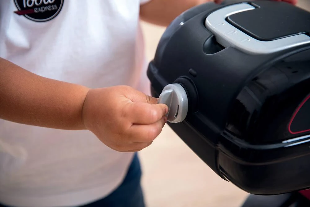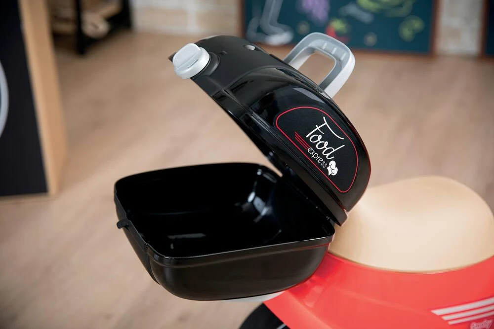 Il est composé de : 2 roues silencieuses, 1 porte-bagage avec 1 top case amovible, 1 phare avant réaliste, 1 clé mécanique, 1 coffre à jouets sous le siège. L’enfant peut alors jouer à préparer toutes sortes de repas et à les livrer à l’arrière de son scooter grâce au top case amovible.