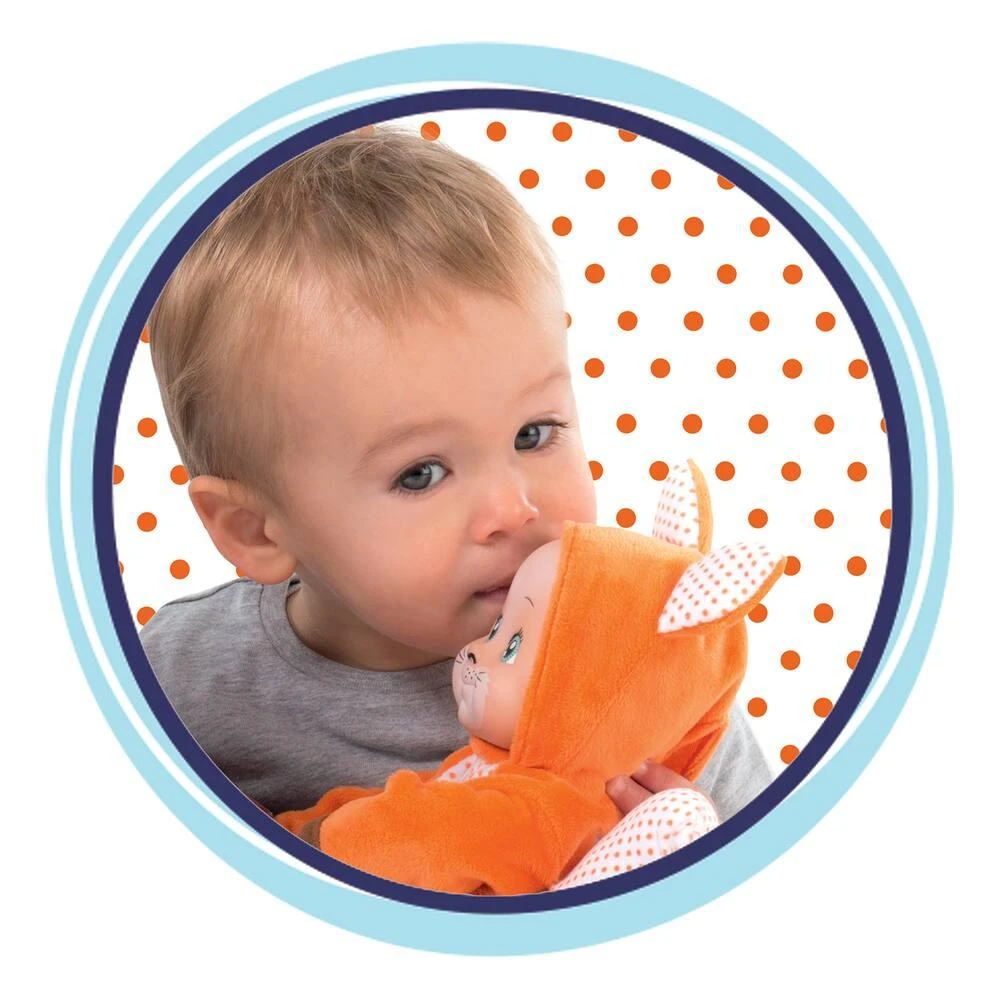 Poupon MiniKiss animaux. Vêtu d’un costume d’animal et maquillé comme tel, il mesure 30 cm et est très léger, facilitant ainsi la préhension par les plus petits dès 12 mois. Seuls ses membres et le devant de son visage sont en plastique, le reste du corps étant en tissu. Lorsqu’on lui presse le ventre il fait un bisou. Modèle lapin ou cerf ou renard.
