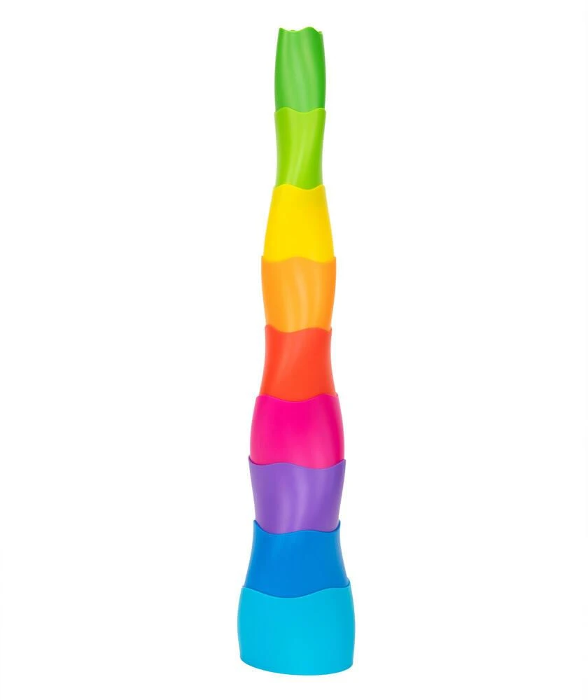 Mais ensuite, emboîtez-les ensemble, tirez sur le plus petit et admirez ! L’ensemble s’étire pour former une grande tour en spirale ! Ce design magnifiquement non intuitif va inspirer des heures de découverte tactile.