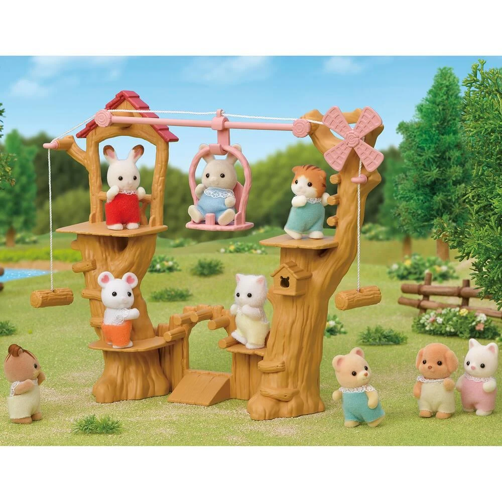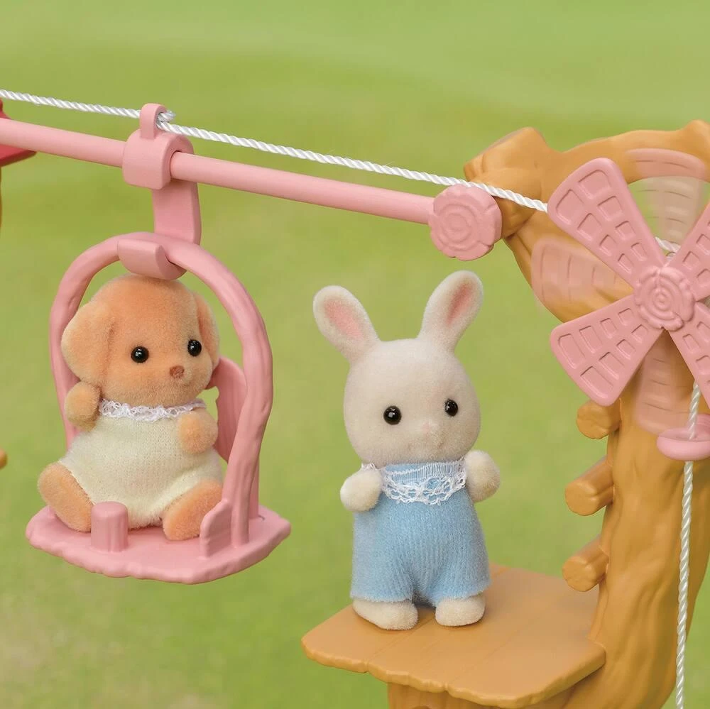 Ce prêt à jouer contient Henry le bébé lapin crème. Tire à gauche ou à droite de la corde pour déplacer le bébé d’un bout à l’autre de la tyrolienne. Elle est connectable avec La cabane dans les arbres et peut se fixer sur la terrasse de la cabane. À assembler avec La cabane dans les arbres, Le chalet du lac, Le camping car ou La cachette des bébés (vendus séparément) pour créer une grande aventure de camping. 1 tyrolienne composée de 2 pièces latérales, une partie basse, une corde et 1 figurine de bébé lapin crème.