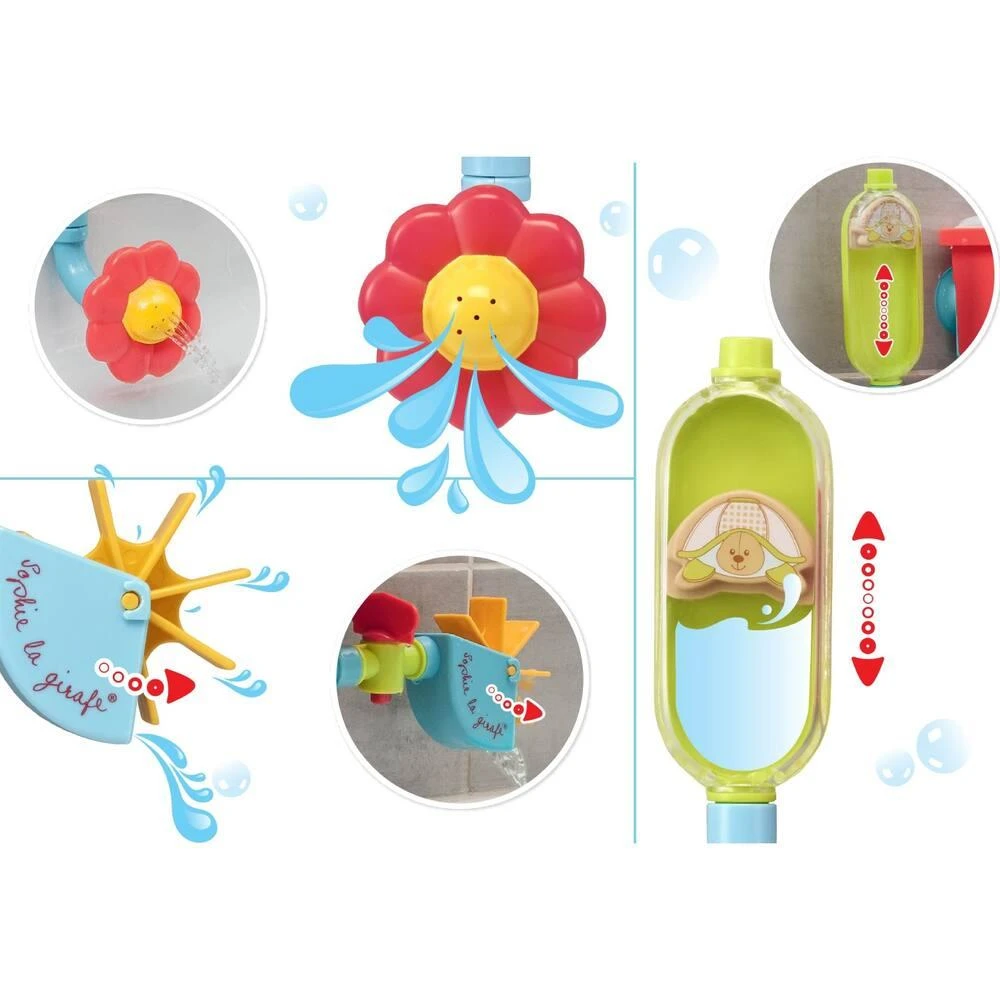 Bébé bricole dans son bain avec ses tuyaux, robinets et activités diverses qu’il monte et démonte ! Tout en s’amusant avec les circuits d’eau, bébé apprend la notion de cause à effet ! Lorsqu’il ouvre un des 3 robinets, bébé peut voir: – Margot la tortue nager dans son bocal – le moulin tourner – l’eau jaillir de la fleur. Si bébé ferme un des 3 robinets la fonction reliée s’arrête aussitôt. Lorsque les 3 robinets sont fermés : – l’eau monte dans le réservoir principal et Sophie la girafe apparait comme par magie avec son masque et son tuba ! Se fixe facilement à la paroi de la baignoire grâce à son système de ventouses.