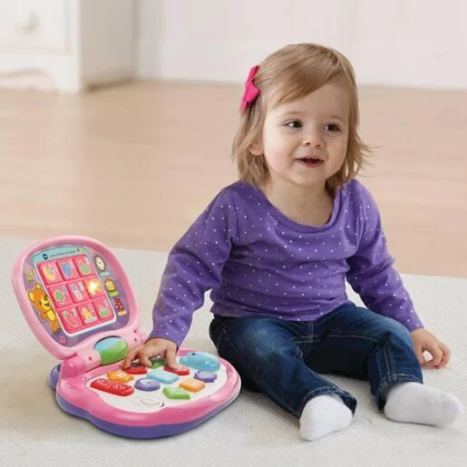 Lumi ordi des tout-petits rose. De 12 à 36 mois. Un super ordinateur avec 9 touches interactives pour découvrir les formes, les animaux et les couleurs. Avec une souris directionnelle pour imiter Papa et Maman, découvrir les chiffres et les notes de musique et déclencher des sons rigolos. Des effets lumineux à l’écran attirent l’œil de Bébé et l’incitent à jouer. Quand il appuie sur les touches, l’écran s’illumine et Bébé découvre une phrase associée : « Le chien aime mordiller son os ». 3 modes de jeu : Animaux, Formes et Musique. Une touche pour découvrir l’alphabet en chanson. Avec une poignée adaptée aux petites mains pour transporter l’ordi partout ! 20 mélodies et 3 chansons. Réglage du volume sonore et arrêt automatique.